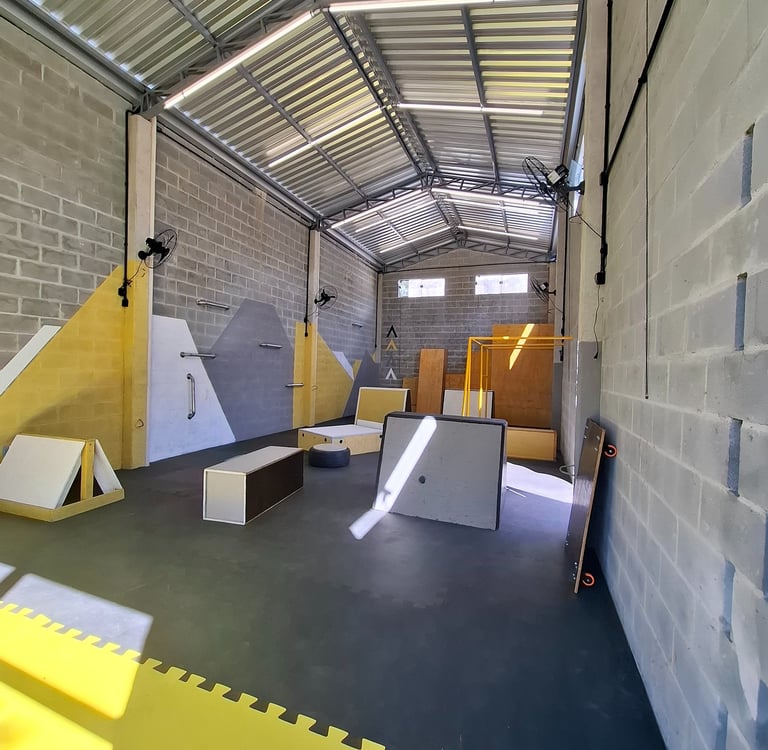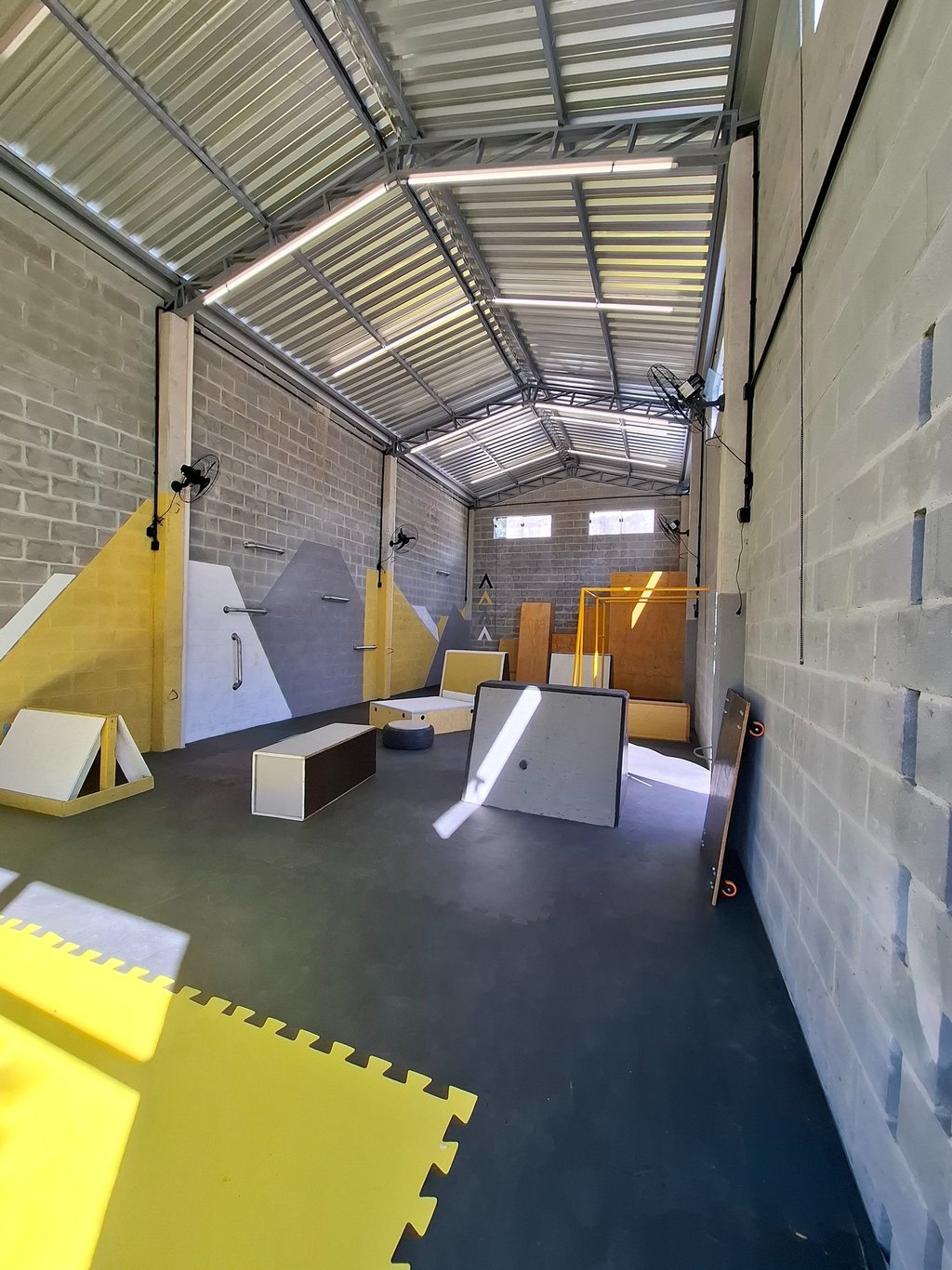 O espaço contempla uma excelente estrutura de treinos, com obstáculos de madeira e concreto; barras de equilíbrio e balanço; colchões para a prática de acrobacias e amortecimento de impactos e magnésio para uma maior aderência ao se balançar em barras.